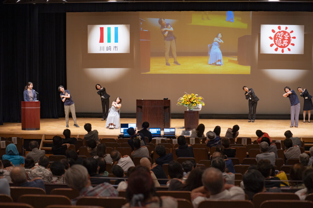 この実演には、特別公演ゲストとして登壇していた俳優・つちやかおりさんも参加し、会場で流れた「ふるさと」に合わせて一緒に歌を歌い、体を動かしてくださいました。つちやさんは公演の中で「認知症の母も昔の歌は覚えていて、一緒に歌う時間は互いに心の支えになりました。音楽には人を前向きにする力があると思います」と話しており、その言葉どおり会場全体が笑顔と活気に包まれ、あたたかな一体感に満ちた時間となりました。