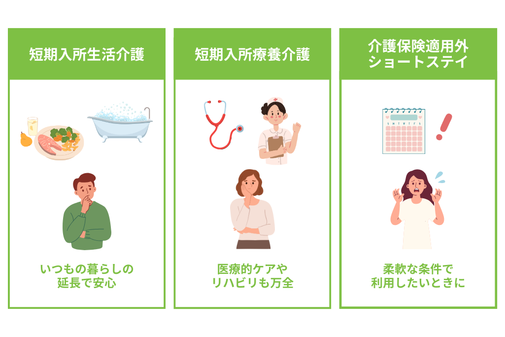ショートステイには、利用者の心身の状態や必要とするケアに応じて、大きく3つの種類があります。それぞれの特徴を理解し、目的に合ったサービスを選ぶことが大切です。
