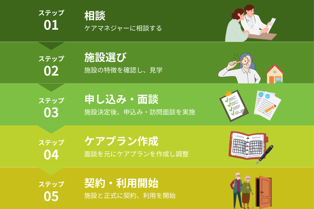 実際にショートステイを利用したいと思ったら、どのように進めればよいのでしょうか。基本的な流れを5つのステップで解説します。