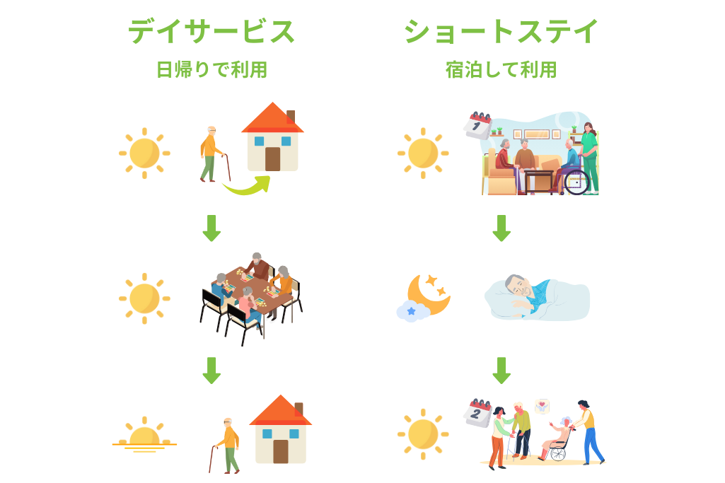 ショートステイとよく比較されるサービスに「デイサービス(通所介護)」があります。この二つの最も大きな違いは「宿泊」ができるかどうかです。デイサービスが日帰りで施設に通い、食事や入浴、レクリエーションなどのサービスを受けるのに対し、ショートステイは宿泊を伴う利用が可能です。そのため、数日間にわたって家を空ける必要がある場合や、夜間の介護も含めて休息を取りたい場合に適しています。