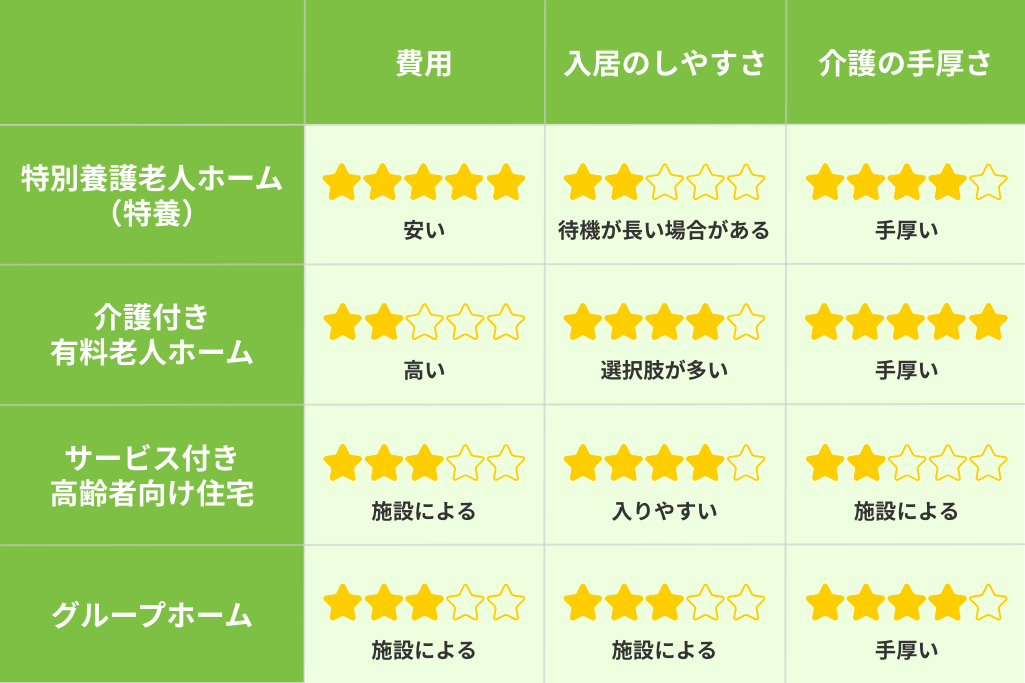 特別養護老人ホーム(特養) | 公的施設で費用が比較的安い。要介護3以上が原則で、待機期間が長い場合がある。 |