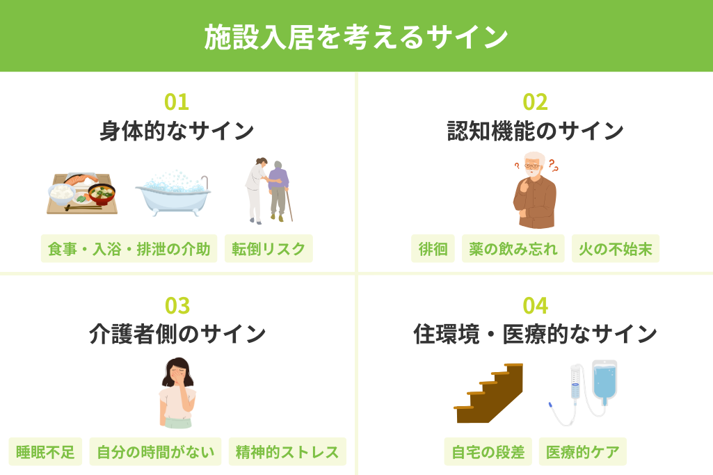 環境・医療的なサイン | ・自宅のバリアフリー対応が困難 ・痰の吸引など、専門的な医療ケアが必要になった ・退院後、自宅での生活に不安がある |
