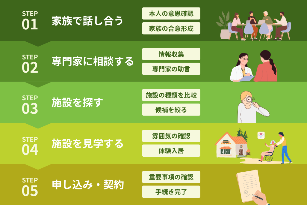親の施設入居を決断したら、次は何をすべきでしょうか。慌てずに、順序立てて準備を進めることが、スムーズな入居につながります。情報収集から契約まで、具体的な5つのステップに沿って解説します。