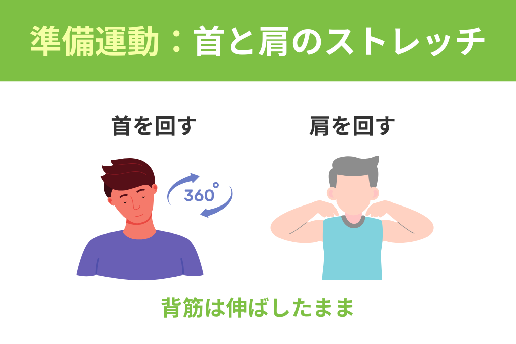 | 肩 | 両肩をゆっくりと上げ下げする。前回し、後ろ回しを数回繰り返す。 | 背筋を伸ばしたまま、肩甲骨を動かす意識で行う。 |