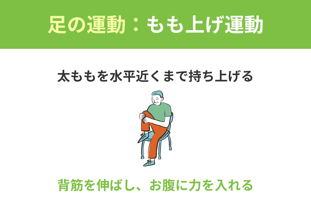 椅子に座ったまま、背筋を伸ばします。その姿勢のまま、片足ずつゆっくりと太ももを高く持ち上げ、ゆっくりと下ろします。この動作を左右交互に繰り返します。この運動は、歩くために必要な腸腰筋を鍛えるのに効果的です。
