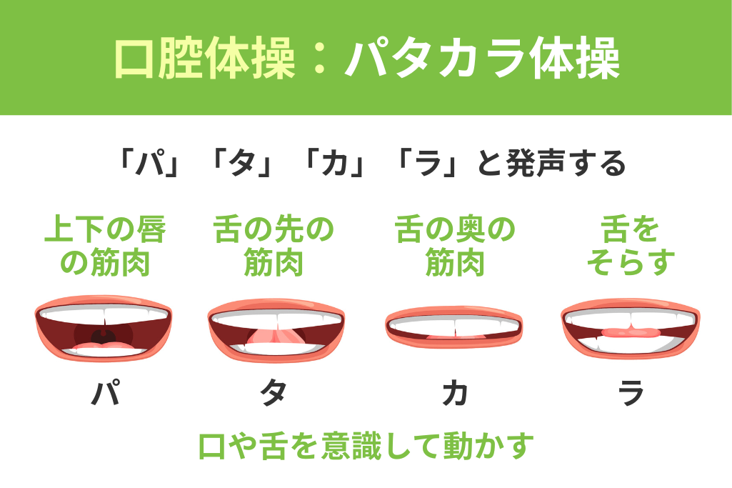 口の周りの筋肉を鍛えることは、食事をおいしく食べたり、はっきりと話したりするために重要です。「パ」「タ」「カ」「ラ」と、一文字ずつはっきりと、大きく口を動かして発声します。「パタカラ、パタカラ」と繰り返し発声することで、飲み込む力を維持し、誤嚥を予防する効果が期待できます。