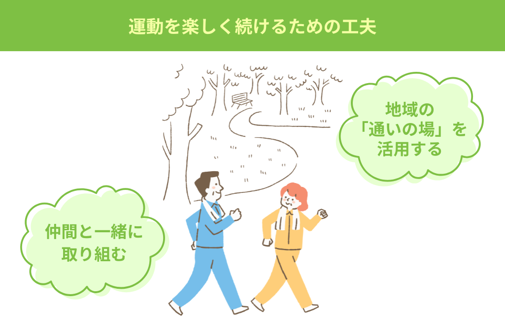 | 仲間作り | 家族や友人を誘って一緒に運動する。 | 互いに励まし合いながら、楽しく続けられる。 |