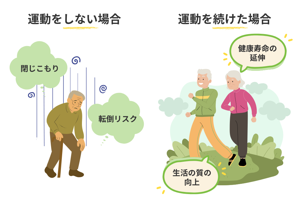 年齢とともに筋肉量は自然と減少し、何もしなければ筋力は衰えていきます。この状態が続くと、立ち上がったり歩いたりといった日常の基本的な動作が困難になり、転倒のリスクも高まります。運動によって筋肉量を維持・向上させることは、骨折や寝たきりを防ぎ、いつまでも自分の足で活動できる身体を保つために不可欠です。