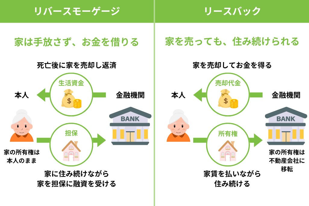 | リースバック | 自宅を一度売却して現金化し、その後は買主と賃貸契約を結んで家賃を払いながら住み続ける方法。まとまった資金を早期に得られる。 |