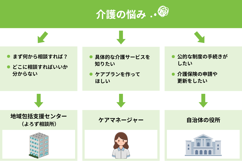 市区町村が設置主体となっている、高齢者のための総合相談窓口です。保健師、社会福祉士、主任ケアマネジャーなどの専門職が在籍しており、介護に関するあらゆる相談に無料で対応してくれます。 どこに相談すれば良いか分からない場合は、まずここを訪ねてみましょう。