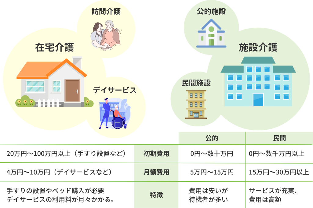 | 在宅介護 | 20万円~100万円以上 | 4万円~10万円 | 手すりの設置やベッド購入などの初期費用。デイサービスなどの利用料が月々かかる。 |