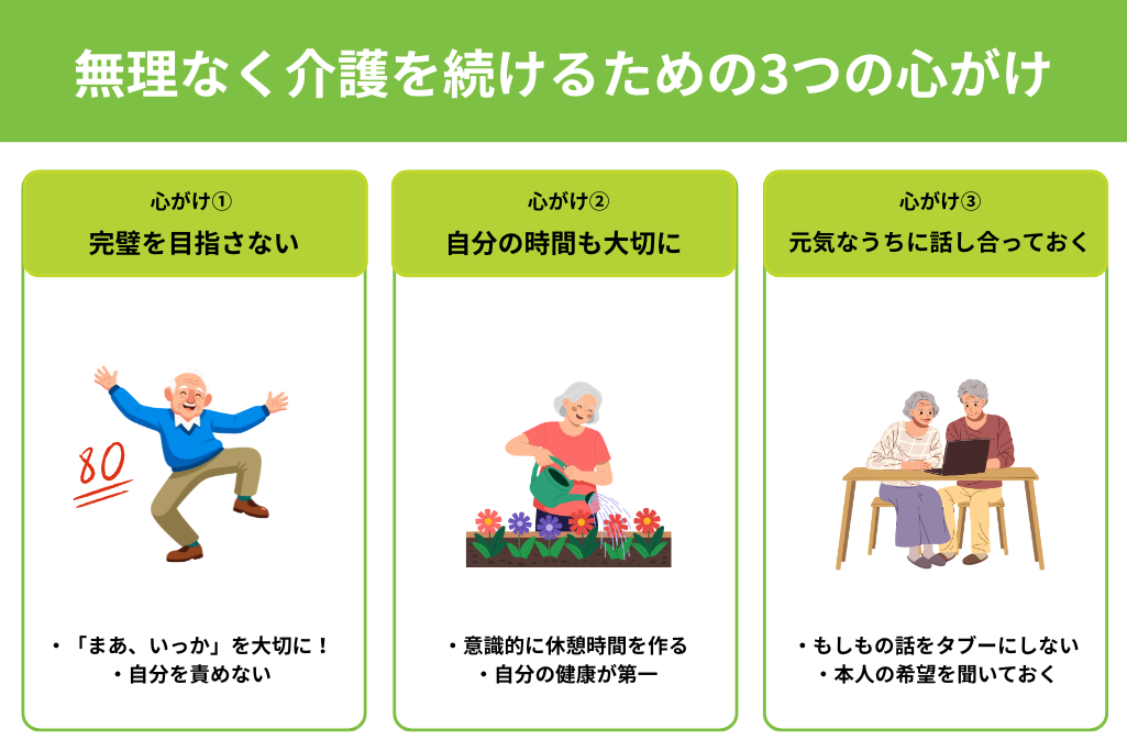 老老介護を乗り越えるためには、サービスを利用するだけでなく、介護者自身の心構えも大切になります。最後に、無理なく介護を続けるための3つのポイントをお伝えします。