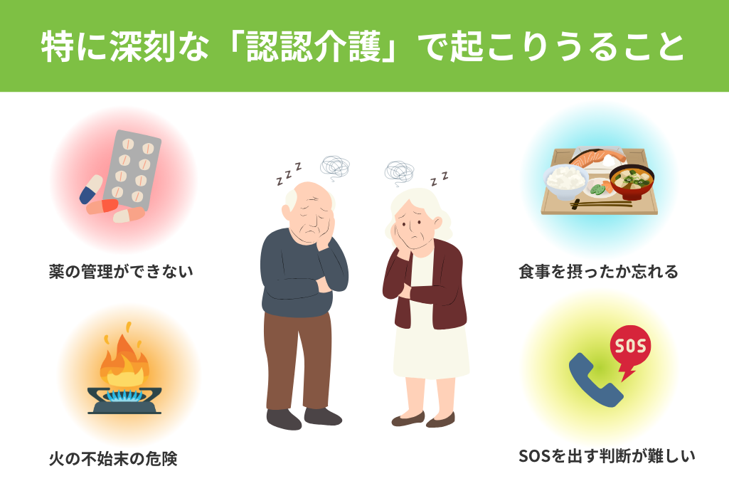 老老介護の中でも特に深刻なのが「認認介護」です。これは、認知症の高齢者が、同じく認知症の高齢者を介護する状態を指します。 認知症の症状により、薬の管理ができなかったり、食事を摂ったことを忘れてしまったり、火の不始末が起きやすくなるなど、命に関わる危険性が高まります。お互いに助けを求める判断が難しくなるため、社会から孤立しやすく、問題が表面化しにくいという特徴も持っています。