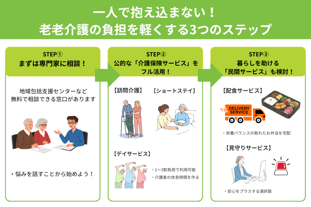 老老介護の負担は、決して一人で抱え込む必要はありません。公的・民間のさまざまなサービスを上手に活用することで、心身の負担を大きく軽減することができます。