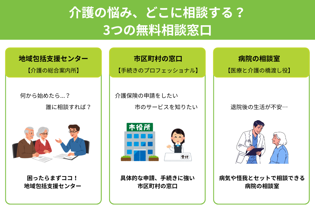 | 病院の相談室 | 医療ソーシャルワーカーが在籍し、退院後の生活や医療、福祉制度の相談に乗る | 病気や怪我で入院し、退院後の在宅介護に不安がある時 |