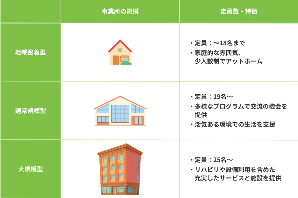 デイサービスは、事業所の利用定員によっても3つの規模に分けられます。規模によって施設全体の雰囲気や利用者同士の関わり方が変わるため、選ぶ際の重要なポイントになります。