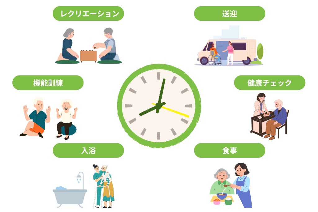 | 自宅と施設間の送迎 | 専用の車両で自宅の玄関先まで送り迎えをしてもらえます。車椅子を利用している方でも乗降しやすいリフト付きの車両を用意している施設も多いです。 |