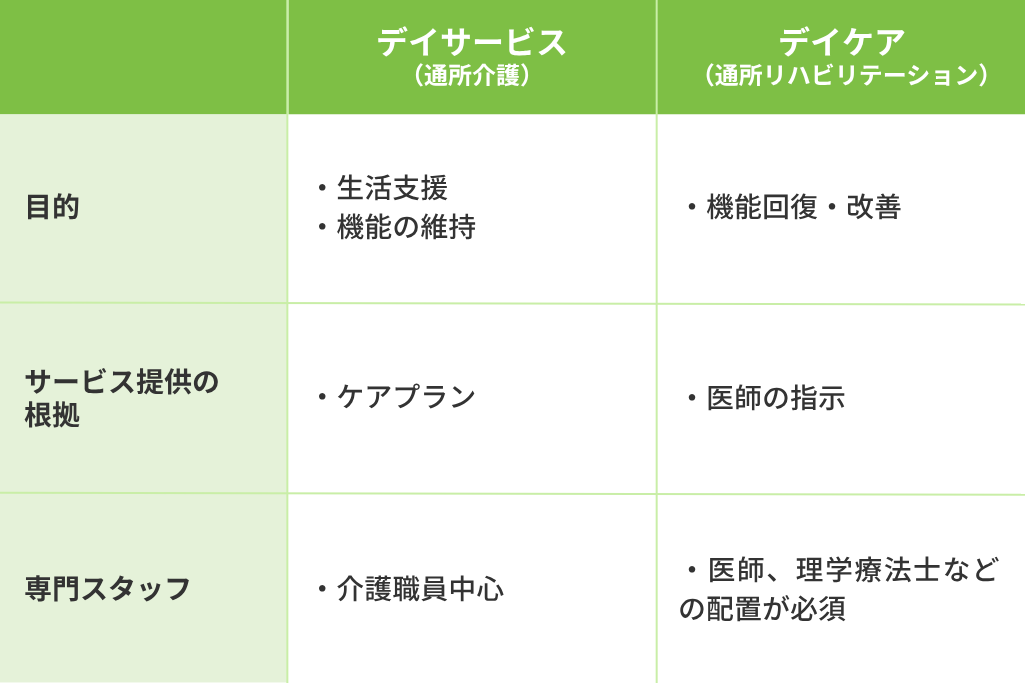 デイサービス(通所介護)とデイケア(通所リハビリテーション)は、しばしば混同されがちですが、その目的が異なります。デイサービスが生活支援や社会参加、心身機能の「維持」を主目的とするのに対し、デイケアは医師の指示のもとで行われる専門的なリハビリテーションを通じて、心身機能の「回復・改善」を目指す医療サービスです。そのため、デイケアには医師や理学療法士などの専門職の配置が義務付けられています。