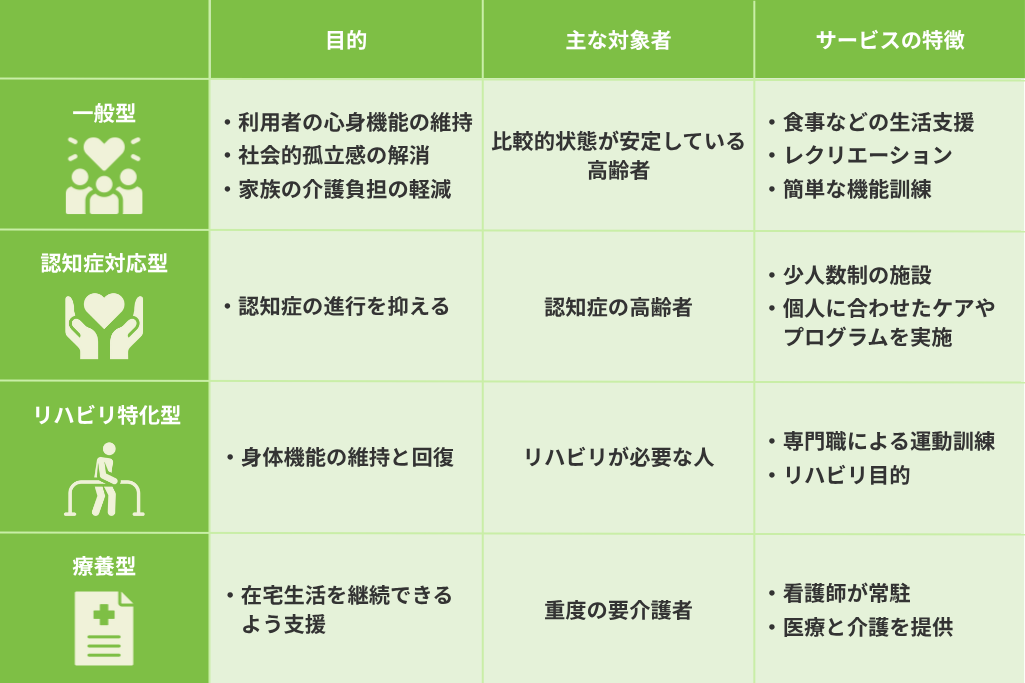 デイサービスは、目的や対象者の状態に合わせて、主に4つの種類に分けられます。それぞれの特徴を理解し、利用者に合ったサービスを選ぶことが大切です。